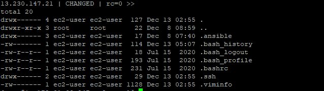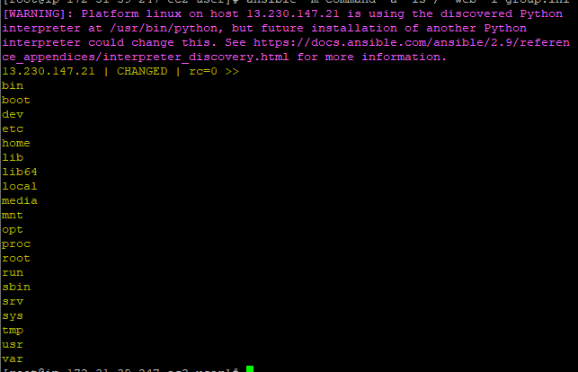 ansible -m command -a 'ls /' web -i group.ini 명령어를 입력하면 web그룹에 대해서만 명령어가 실행된다