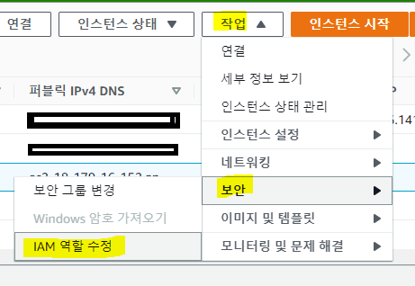ec2에 s3을 접근할 수 있도록 만들기 위해서 작업 > 보안 > IAM 역할 수정을 한다