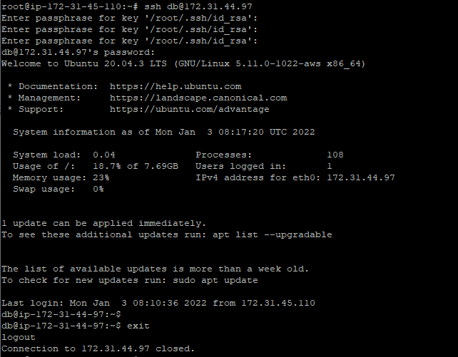 변경 후에는 sudo service ssh restart 명령어를 통해 ssh를 재시작시켜준다 (db1, db2 둘다 해줌)