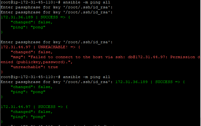 그리고 ansible -m ping all 을 해주었고, key 비밀번호를 입력하면 ping에 성공~!~!!!!