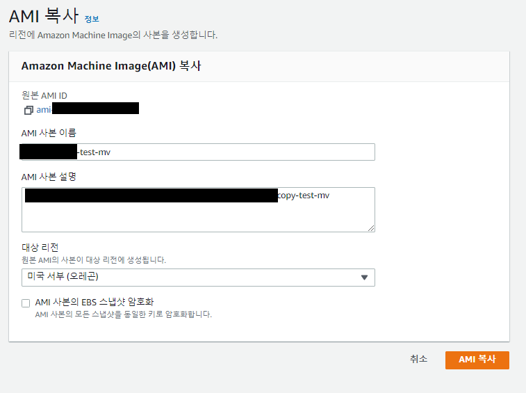AMI복사를 누르면 상단에 아래와 같은 팝업이 나타난다