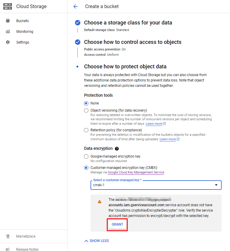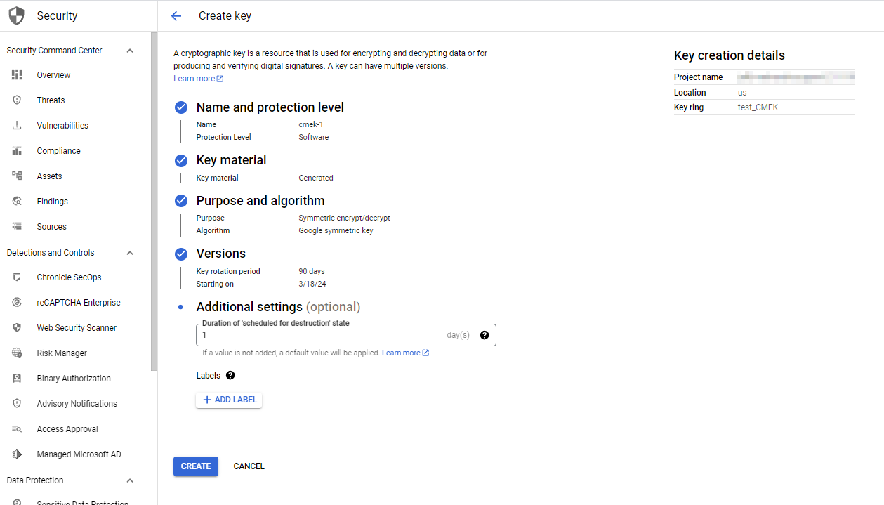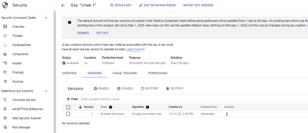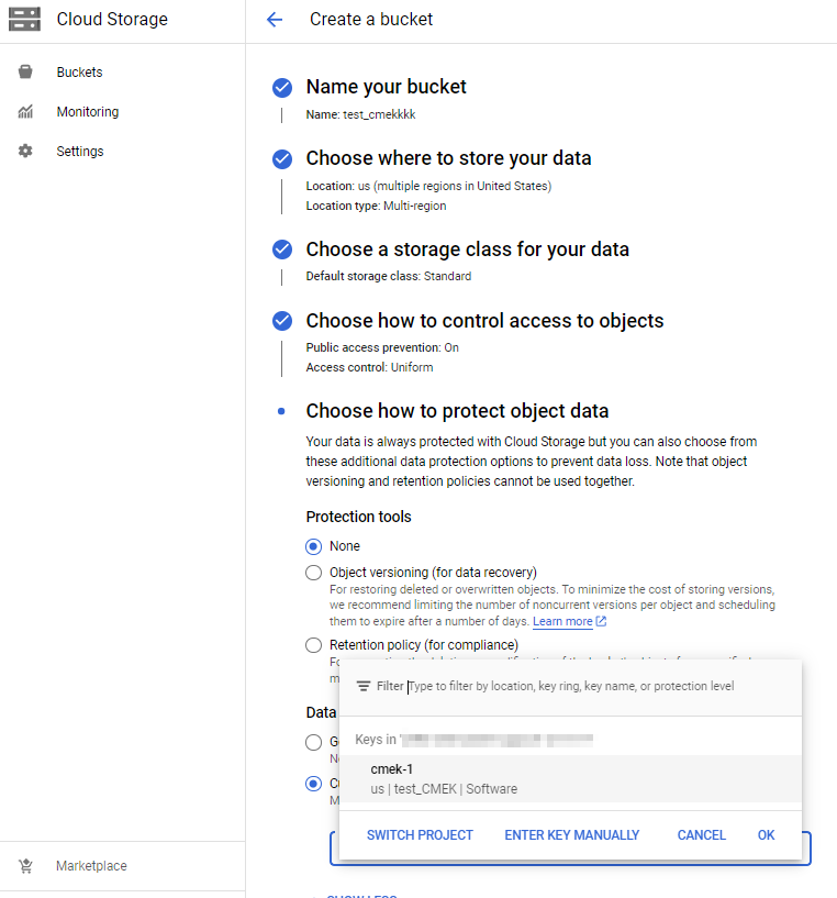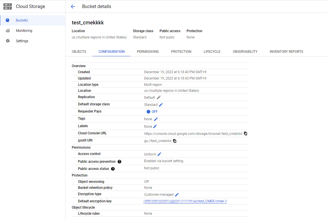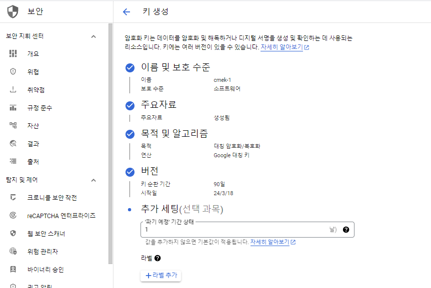 그러면 이제 키 cmek-1을 사용하고 있다고 여기서 확인 가능