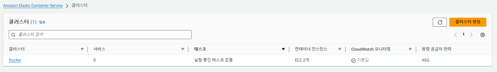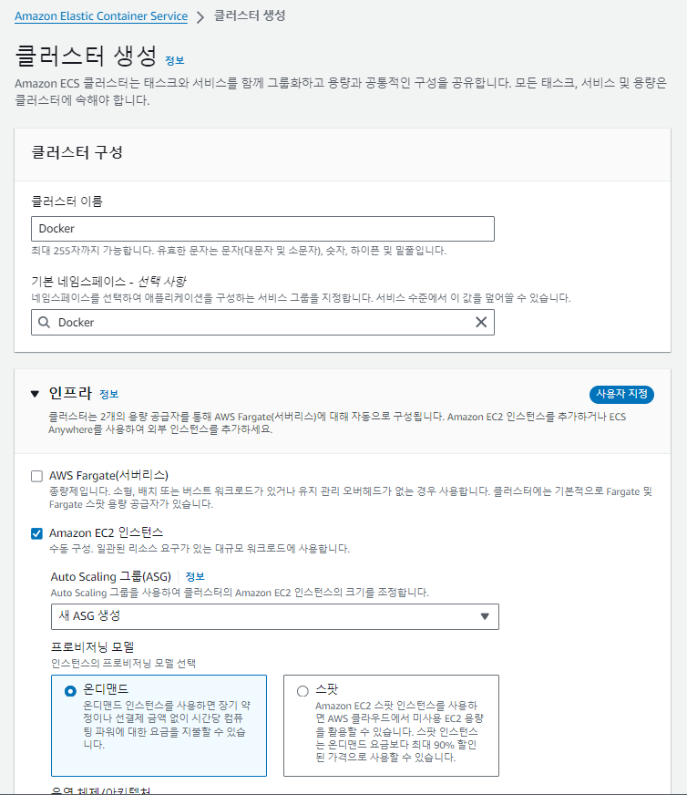 Docker라는 이름으로 클러스터를 생성하고 EC2인스턴스로 선택하였다