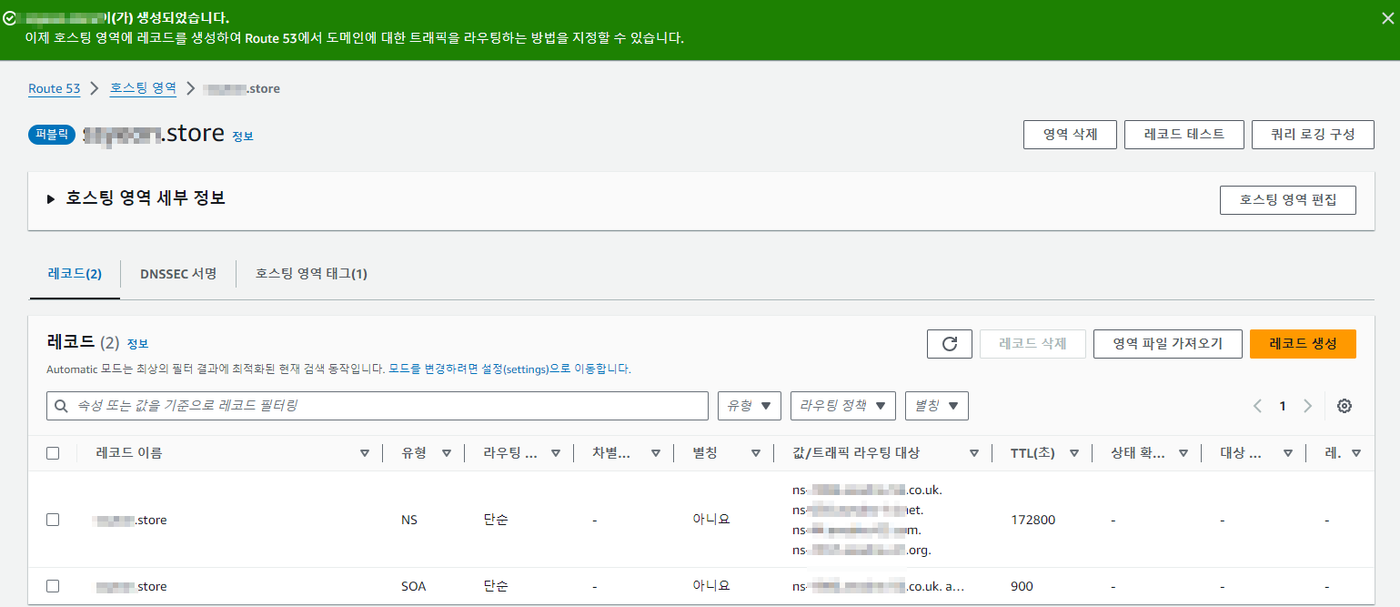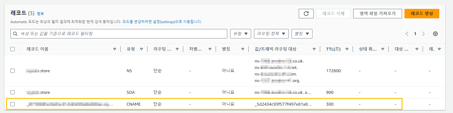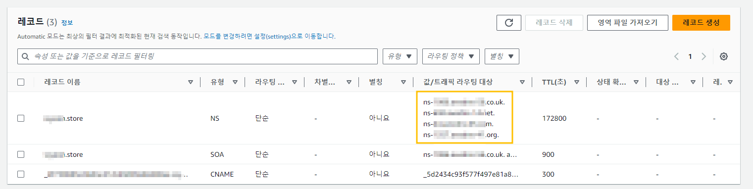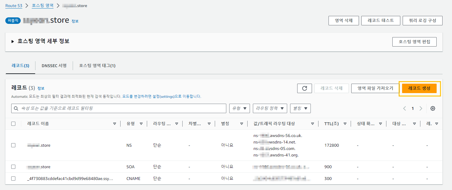생성을 완료하고 나면 Route53 페이지의 레코드 부분에 3개의 항목으로 늘어남을 확인할 수 있다