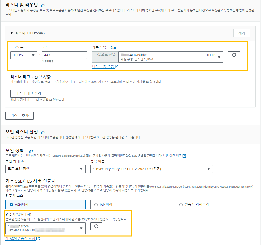 프로토콜은 HTTPS 443으로 설정하고 만들어준 인증서도 같이 첨부해준다