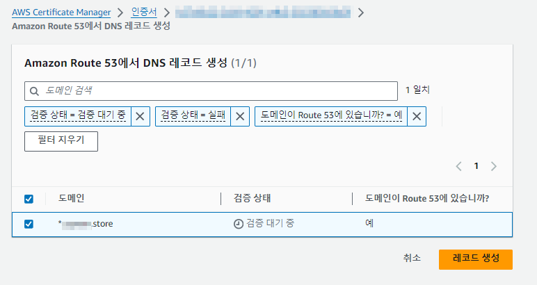 ACM -> 인증서 -> Route 53에서 레코드 생성하기를 누르면 이제 선택을 할 수 있다