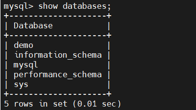 mysql로 들어가서 demo라는 이름의 데이터베이스를 만들었다