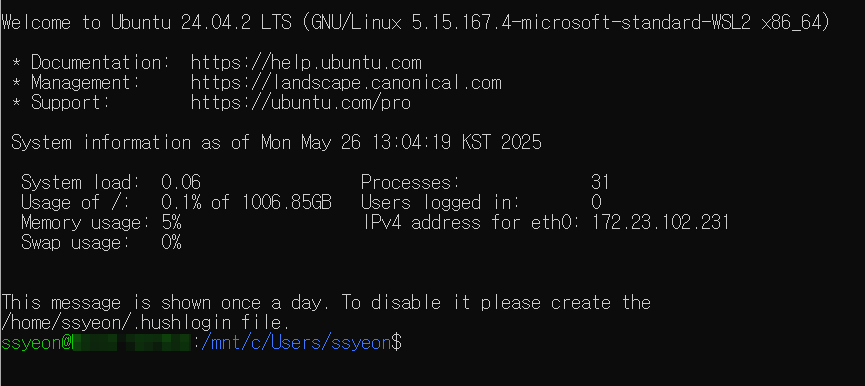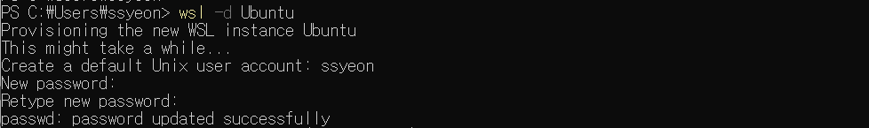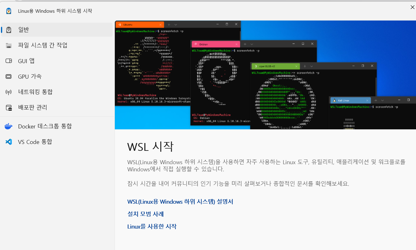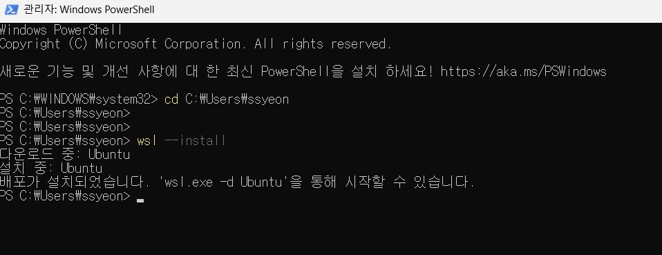 배포가 설치되지 않아서 다시 wsl --install 명령어로 설치를 하렸고 정상적으로 설치되었음을 확인할 수 있습니다