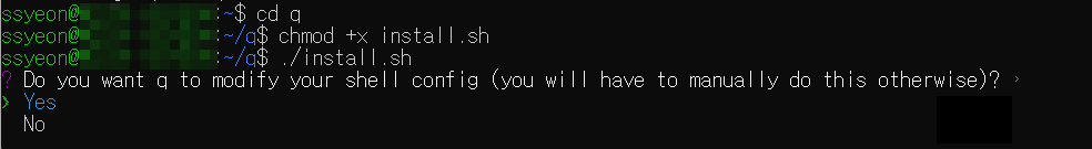셸 구성을 수정할지 묻는 메시지가 표시됩니다. Amazon Q Developer CLI 실행 파일을 가리키는 새 경로를 추가하는 것이므로 "예"를 선택합니다