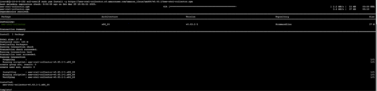sudo yum install -y https://aws-otel-collector.s3.amazonaws.com/amazon_linux/amd64/v0.43.1/aws-otel-collector.rpm
