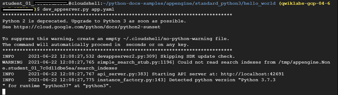 hello_world앱의 app.yaml 구성 파일이 있는 디렉터리 내에서 로컬 개발 서버를 시작