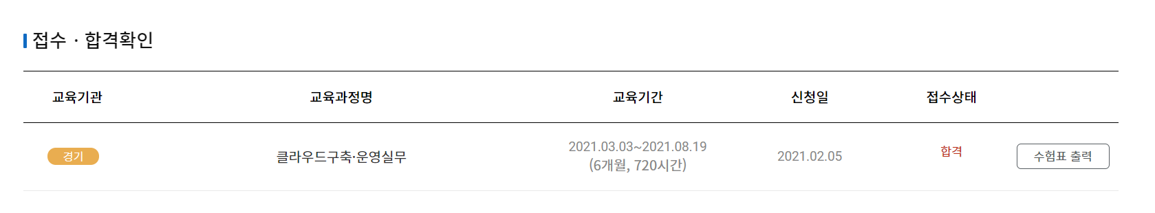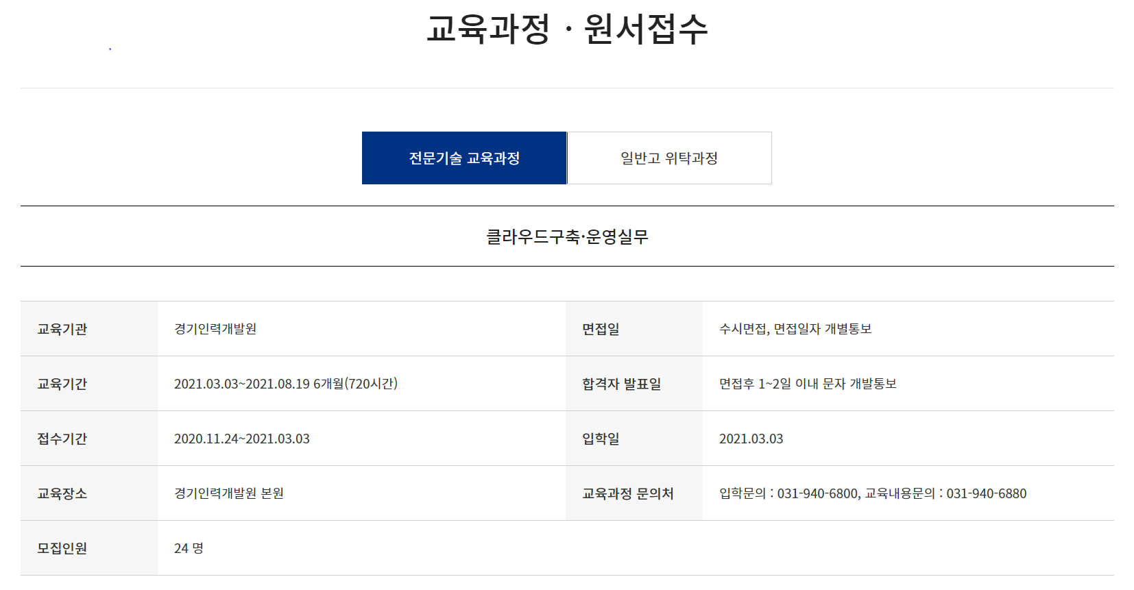 교육과정ㆍ원서접수 클라우드구축·운영실무 교육기관 경기인력개발원 면접일 수시면접, 면접일자 개별통보 교육기간 2021.03.03~2021.08.19 6개월(720시간) 합격자 발표일 면접후 1~2일 이내 문자 개