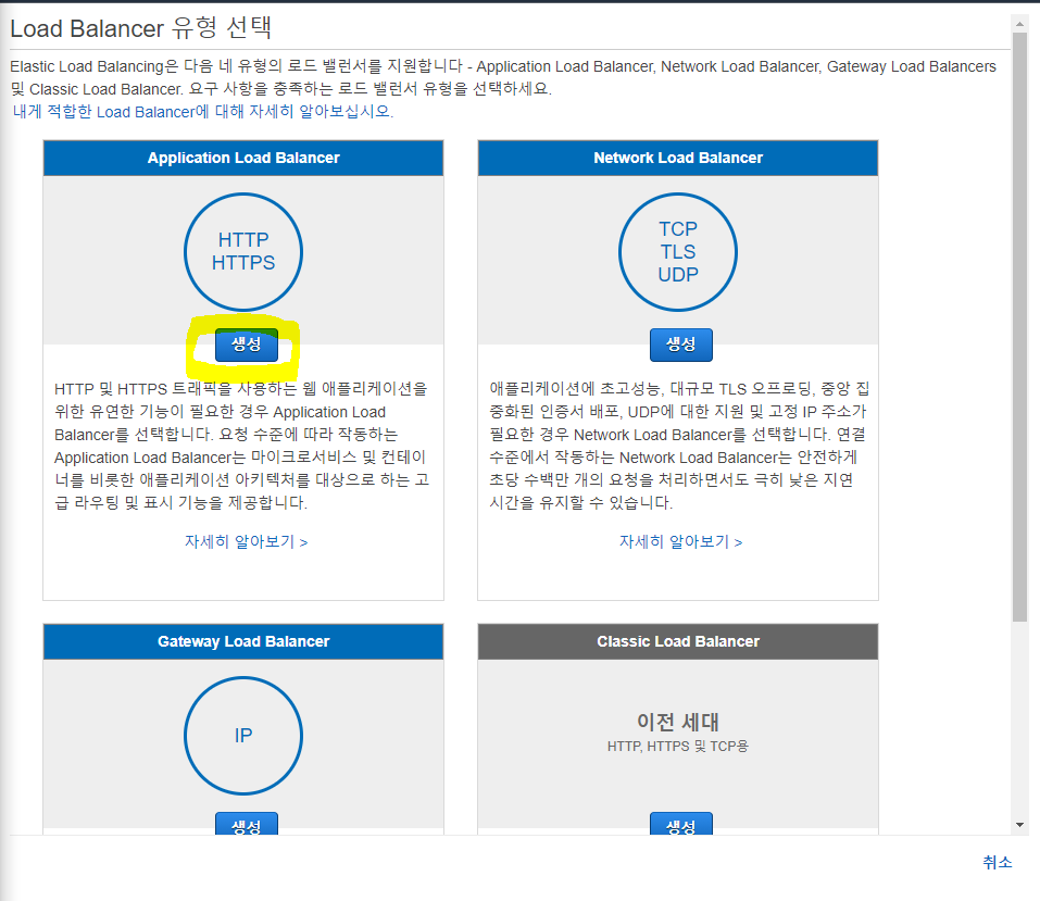 로드밸런서 유형중에서 HTTP/HTTPS 를 선택해서 생성!